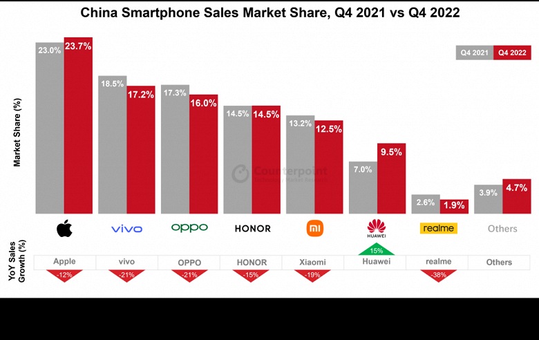 اپل برای نخستین بار به دومین تولیدکننده بزرگ گوشیهای هوشمند در بازار چین تبدیل شد. تحلیلگران موسسه تحقیقاتی Counterpoint Research به ارزیابی بازار چین طی دوره 3 ماهه گذشته و دوره 12 ماهه سال 2022 پرداختند. در 3 ماهه چهارم سال 2022 شرکت اپل به لطف عرضه آیفونهای جدید خود به رهبر بلامنازع بازار چین و بازارهای بینالمللی تبدیل شد.
