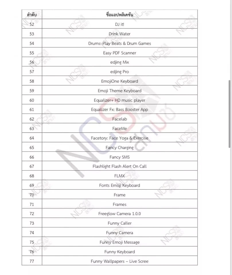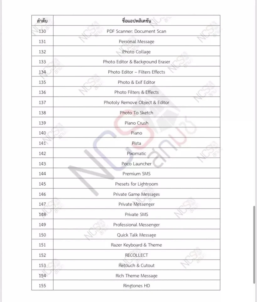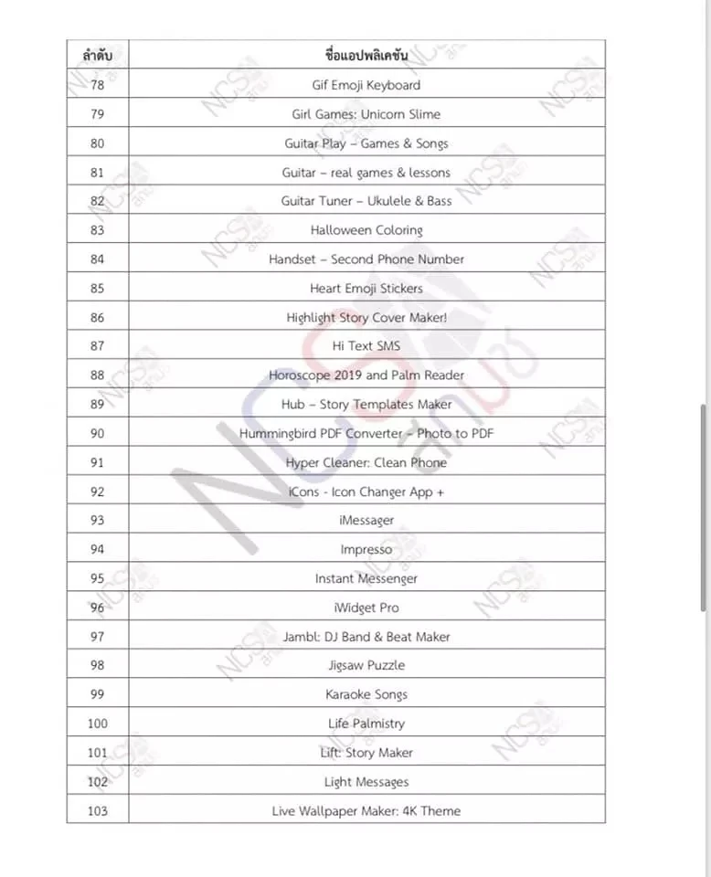 در ادامه، فهرست کامل اپلیکیشنهای مخرب در سیستمعاملهای اندروید و iOS ارائه شده است. وزارت جامعه و اقتصاد دیجیتال تایلند و آژانس ملی امنیت سایبری اعلام کردهاند که درخواست حذف این برنامهها از اپ استور و پلی استور را با شرکتهای اپل و گوگل در میان گذاشتهاند.