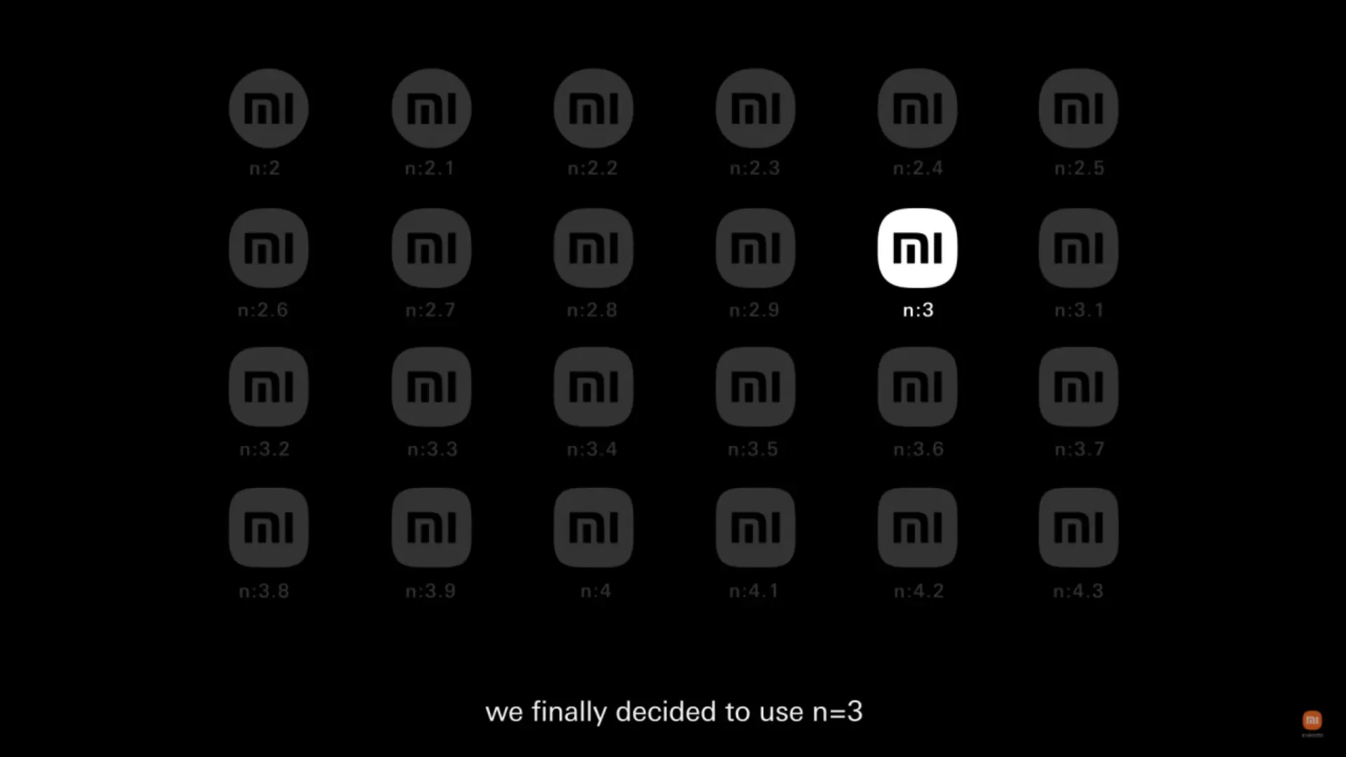 در سال 2021 شیائومی به منظور بازطراحی لوگو خود با نسبت ابعاد n:3 سرمایهگذاری قابلتوجهی را انجام داد. انحنای ظریف لوگو به منظور انتقال حس ظرافت و نوآوری طراحی شده است. شیائومی با عرضه MIUI 15 این فلسفه طراحی را به آیکونهای برنامههای خود نیز تعمیم داده و زبان بصری منسجم و هماهنگ با هویت برند را به معرض نمایش میگذارد. چنین ادغامی نه تنها تعهد شیائومی به طراحی فوقالعاده را تقویت میکند؛ بلکه با ایجاد ارتباط هماهنگ میان لوگو و رابط، تجربه کلی کاربری را نیز بهبود خواهد داد.