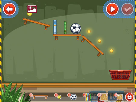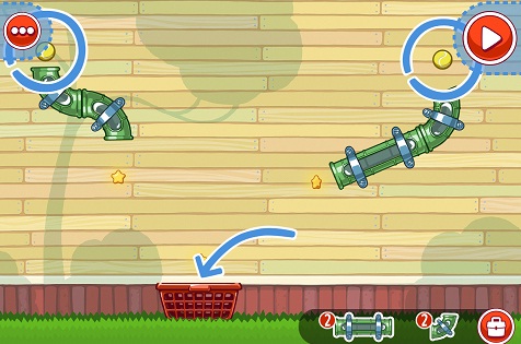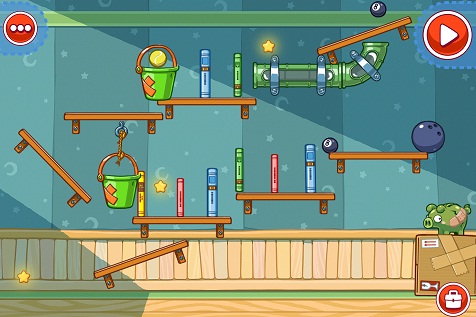 خب از مقدمات خارج میشویم و سراغ اصل کار میرویم! چپتر اول بازی یعنی The Classroom به نوعی حالت قسمت آموزشی بازی را نیز دارد و تمامی مراحل فوقالعاده آسان طراحی شدهاند. در ابتدای هر مرحله اشیایی سر جای خودشان فیکس شدهاند که شما قابلیت تغییر و جابهجایی آنها را ندارید. در همان ابتدا هدف هر مرحله برای شما مشخص میشود که اصولا در اول بازی عبارتند از هدایت توپ از جای خود به داخل سبد! در مسیر حرکت توپ به داخل سبد نواقص و کمبودهایی وجود دارد که شما باید با اشیایی که بازی در اختیارتان قرار میدهد آنها را برطرف کنید و توپ را به سبد برسانید و مرحله را تمام کنید (البته بحث توپ و سبد تنها هدفهای شما نیستند و با پیشرفت در طول بازی هدفها و مسیرها پیچیدهتر و سختتر میشوند). اولین تفاوت الکس شگفت انگیز با پرندگان خشمگین همینجا اتفاق میافتد. پرندگان خشمگین بر اساس امتیاز نهایی مرحله و پرندگان استفاده نشده به شما ستاره میداد اما اینجا زحمت جمع کردن 3 ستاره هر مرحله بر عهده خودتان است (دقیقا شبیه به بازی معروف Cut the Rope). سه ستاره در طول هر مرحله قرار دارند و شما باید با مسیر سازی خودتان کاری کنید اشیای داخل بازی با ستارهها برخورد کنند، مثلا توپ در مسیر حرکتش به ستارهها برسد. هر تعداد ستاره را به این روش به دست آوردید برای شما ثبت میشود و البته شرط باز شدن چپترهای بعدی نیز جمع کردن تعداد معینی ستاره است که اصولا در این راه به مشکلی برخورد نمیکنید و به ور معمول در هر مرحله حداقل 1 ستاره را میتوانید با چند بار سعی و خطا به دست آورید.