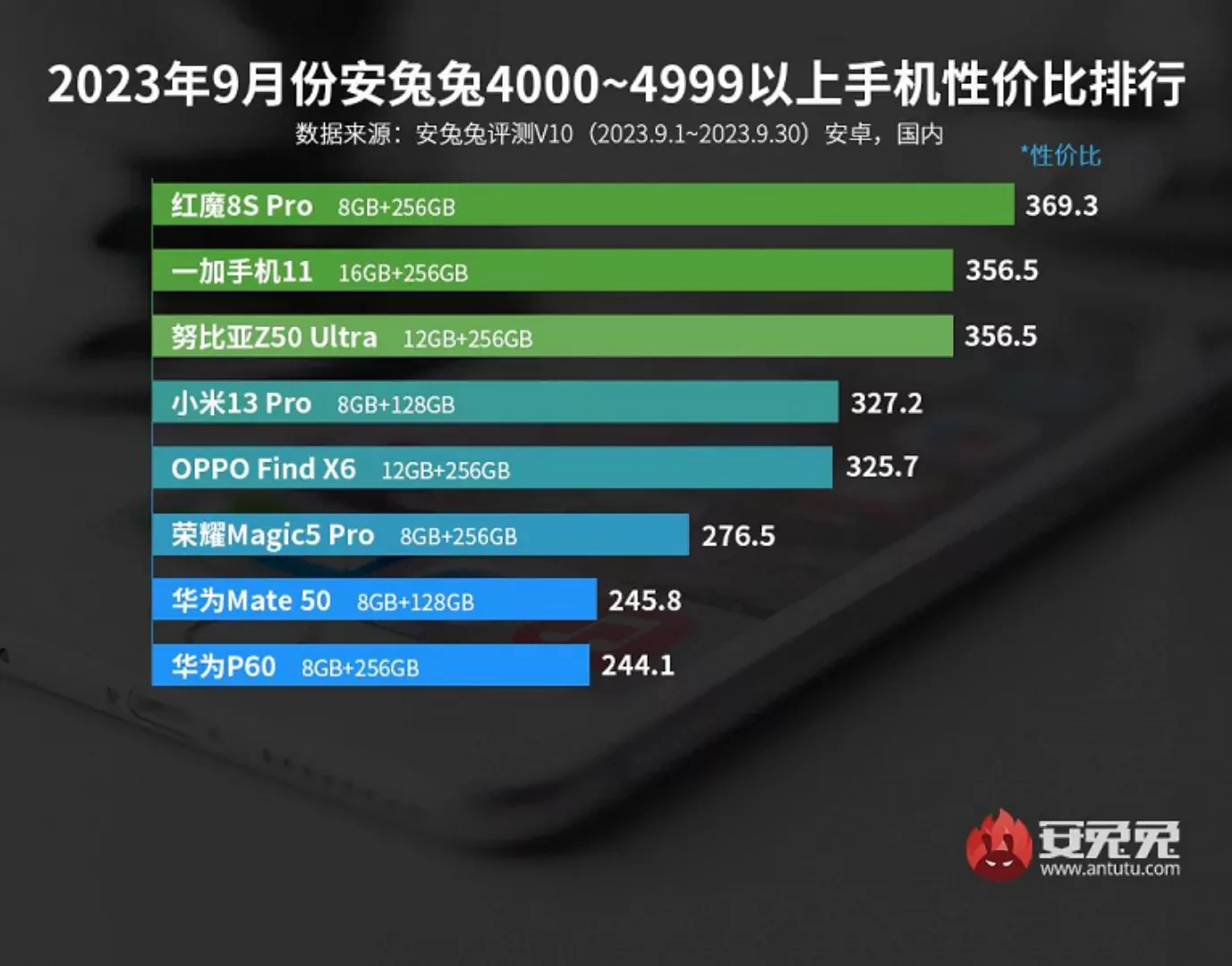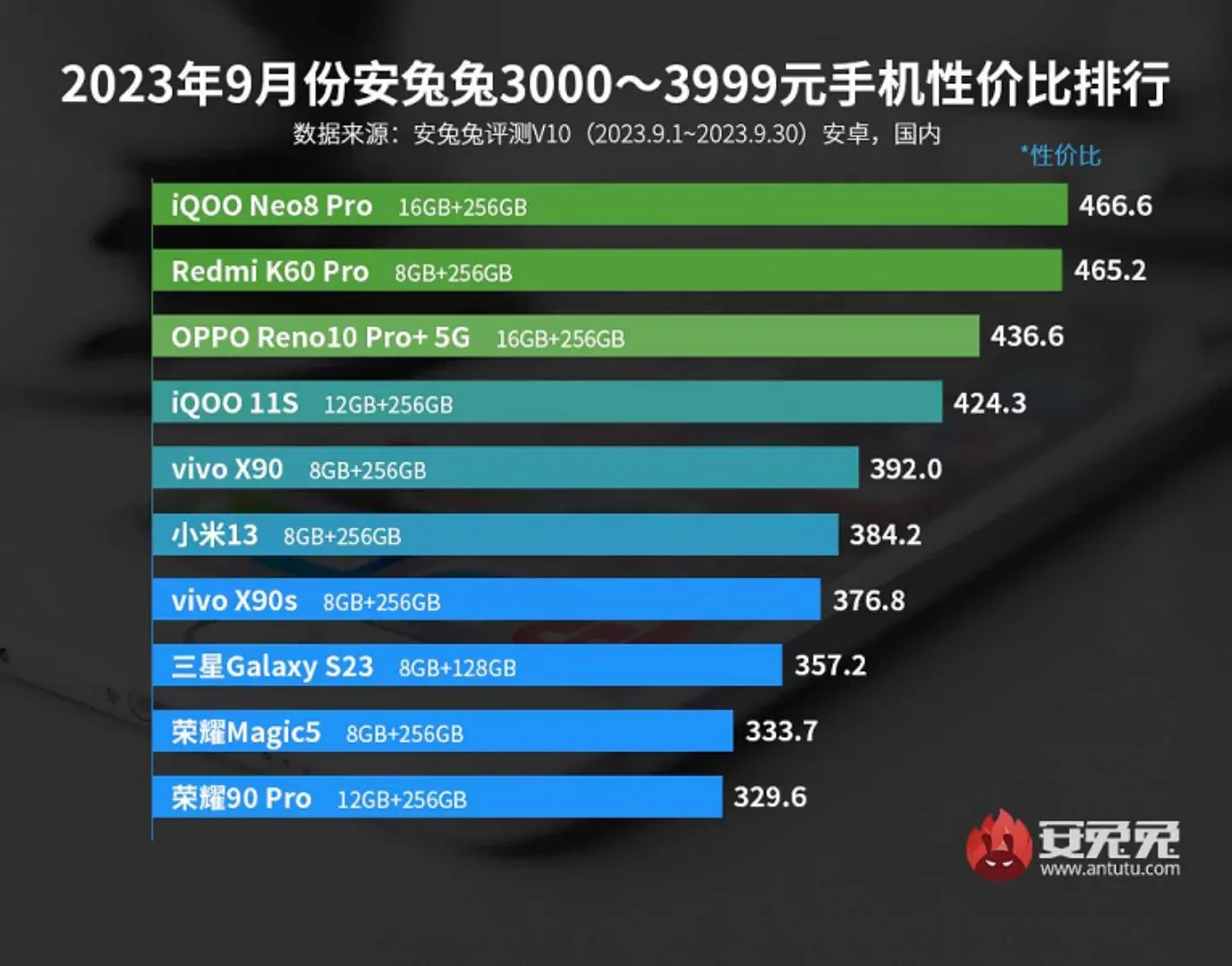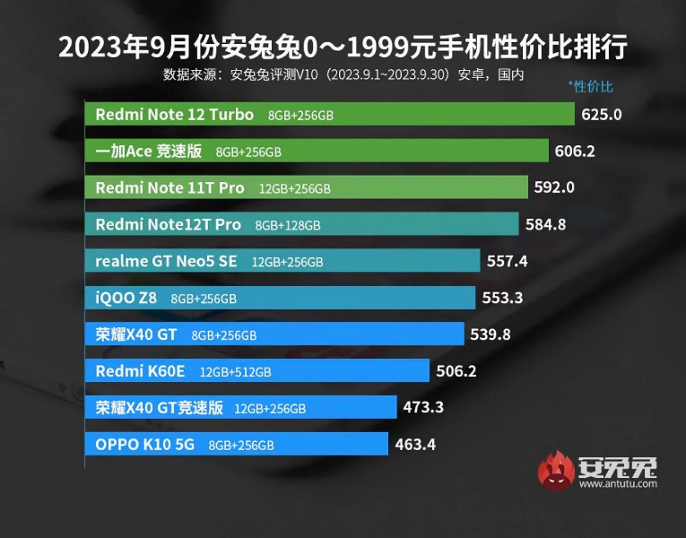 تیم بنچمارک AnTuTu آخرین رتبهبندی گوشیهای هوشمند اندرویدی برتر به لحاظ قیمت و عملکرد در ردههای قیمتی مختلف تا پایان ماه سپتامبر 2023 را منتشر کرده است. ارزانترین رده شامل گوشیهای با حداکثر قیمت 1999 یوان (274 دلار) بوده و در این کلاس، گوشی ردمی نوت 12 توربو کماکان جایگاه نخست را در اختیار دارد؛ اما ردمی نوت 11T پرو پس از وانپلاس Ace Racing Edition به جایگاه سوم سقوط کرده است. در دستهبندی 2000 تا 2999 یوانی (275 تا 411 دلاری) یک انقلاب واقعی به چشم میخورد. یک گوشی هوشمند مبتنی بر تراشه پرچمدار اسنپدراگون 8 نسل 2 کوالکام وارد این بخش نسبتا اقتصادی شده است. این گوشی نوبیا Z50 نام داشته و بلافاصله جایگاه اول را به خود اختصاص داده است. کارشناسان وبسایت AnTuTu این محصول را یک پیشنهاد دیوانهوار نامگذاری کردهاند؛ چرا که کاربران با پرداخت مبلغ تنها 343 دلار میتوانند دستگاهی با قویترین پلتفرم اندرویدی حال حاضر بازار را خریداری نمایند. لنوو لجیون Y70 در مقام دوم قرار گرفته و ردمی K60 نیز جایگاه سوم را تصاحب نموده است.