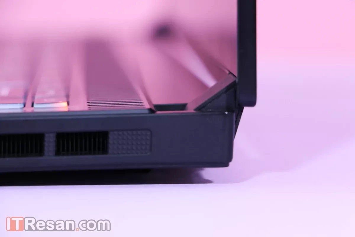 در دو گوشه پایین چپ و پایین راست، دو شیار باریک قرار داده شده که محل قرارگیری بلندگوهای لپتاپ هستند.