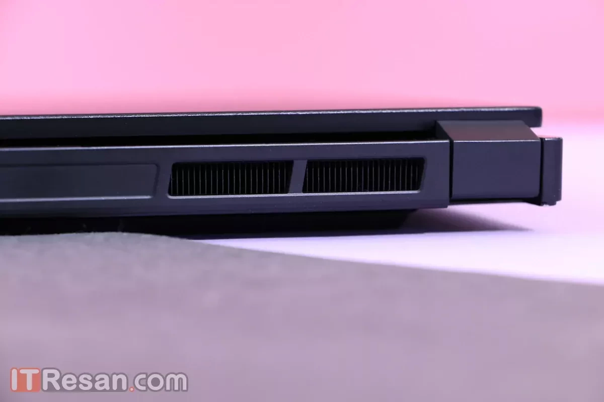 در بخش پشتی لپتاپ، مجموعه 6 دریچه (2 دریچه سمت چپ و 4 دریچه سمت راست دستگاه) برای جریان هوا قرار گرفتند که نسبت به دریچههای کناری، کمی بزرگتر هستند. در کنار این دریچهها و در گوشهترین نقاط بدنه، دو لولای نگهدارنده صفحه نمایش دیده میشوند.