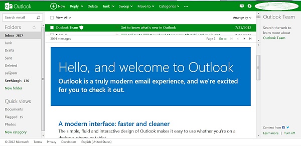 Outlook.com رابط ساده و جذابی دارد که فقط آنچه شما نیاز دارید را نشان میدهد. در پست الکترونیکی Outlook.com همه لوازم برای کاربردی شدن وجود دارند، این سخن را شما فورا پس از ورود به سیستم متوجه خواهید شد. شباهت به جیمیل واضح است. شما میتوانید پیامهای خود را از طریق کلیک کردن بر روی آنها و یا با چک کردن جعبه در سمت چپ انتخاب کنید. مانند جیمیل، شما قادر هستید یک پنجره پیش نمایش را برای اسکن کردن محتویات یک پیام بدون نیاز به باز کردن آن اضافه کنید. استفاده از پنجره پیش نمایش یکی از موارد مورد علاقه من است زیرا اجازه میدهد تا در صندوق پستی خود و لیست پوشهها به طور مستقل بگردید. اگر شما از پنجره پیش نمایش استفاده نمیکنید، نامهها در کل صفحه به نمایش در خواهند آمد، که بنطر من خسته کننده خواهد بود.سازماندهی پیام