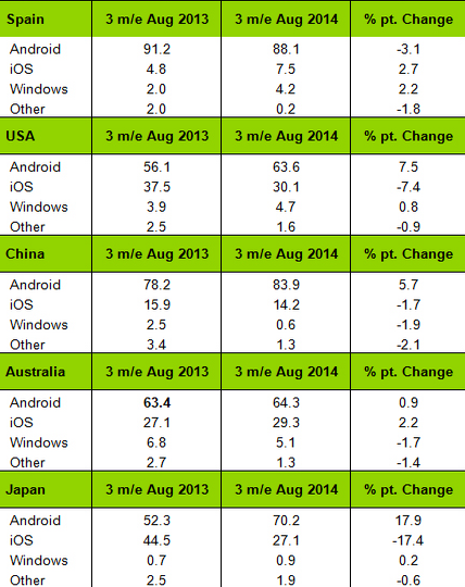 اما اگر به صورت جداگانه به بازار اسپانیا نگاهی داشته باشیم میبینیم که اندروید در اسپانیا 88.1% از بازار را در اختیار دارد. در خارج از آمریکا، بزرگترین بازار سیستم عامل iOS در اختیار استرالیا با 29.3% است. این موضوع برای مایکروسافت در ایتالیا رخ داده است سهمی برابر با 14.4% را در این کشور دارد. در ادامه میتوانید جزئیات بیشتری در مورد سهم هر سیستم عامل از بازار هر کشور مشاهده نمایید.