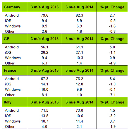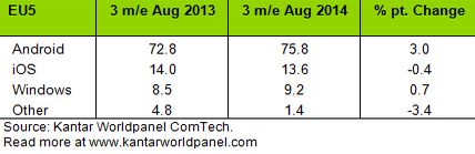 همچنین در 5 بازار بزرگ اروپا نیز اندروید به پیشروی خود ادامه داده است و با رشد 3 درصدی به 75.8% از بازار تلفنهای هوشمند رسیده است. همچنین سیستم عامل iOS اپل نیز با از دست دادن 0.4% از بازار به سهم 13.6% رسیده است. ویندوزفون نیز حالا 9.2% از بازار را تصاحب کرده است که این موضوع پس از رشد 0.7 درصدی آن طی سال گذشته است.