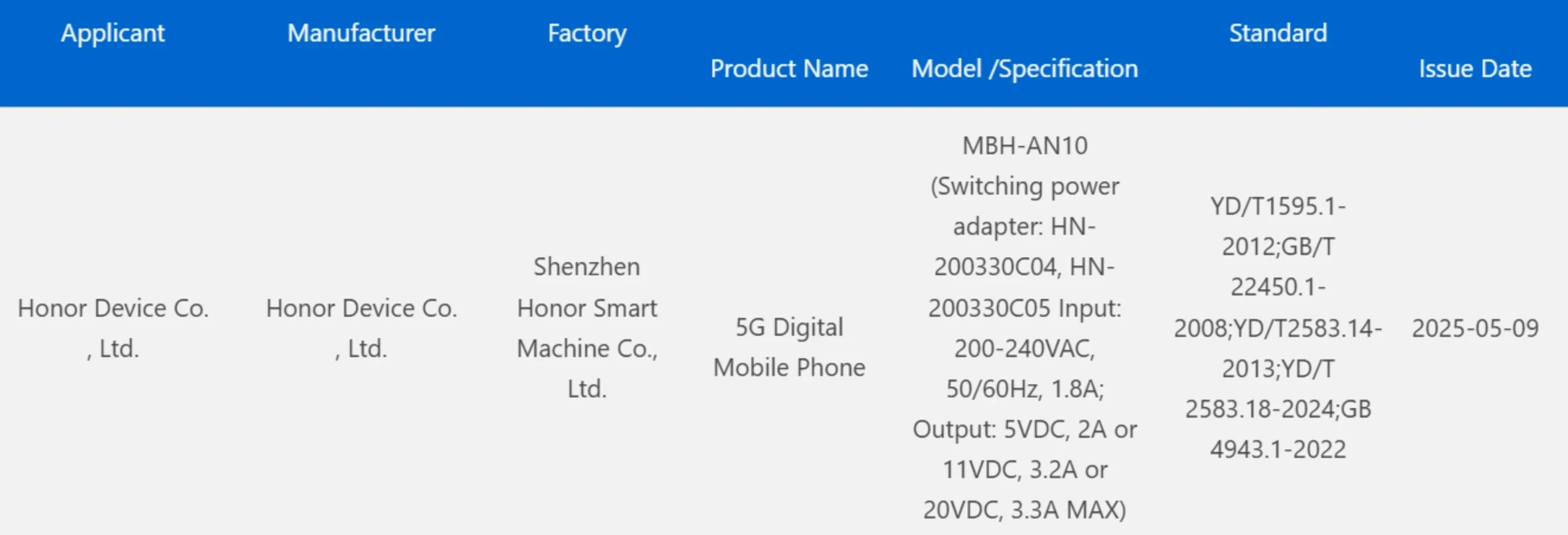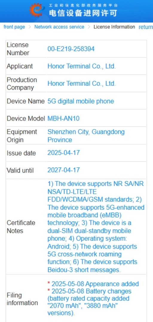 در یک مورد تحول جدید، گوشی هوشمندی از آنر که ظاهرا همان مدل مجیک V5 است؛ در پایگاه داده پلتفرمهای چینی صدور گواهینامه رویت شده است. این پدیده از عرضه قریبالوقوع دستگاه مورد اشاره حکایت دارد. گوشی هوشمند آنر با شماره مدل MBH-AN10 اخیرا موفق به دریافت گواهینامههای MIIT و 3C در کشور چین شده است.