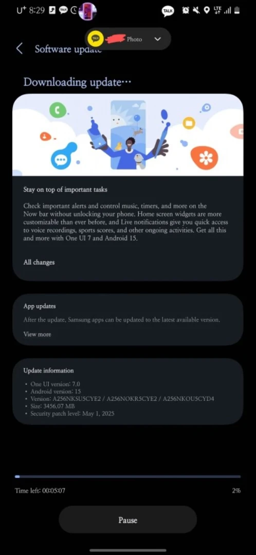 بهروزرسانی One UI 7 برای سامسونگ گلکسی تب S6 لایت 2024 نیز هماکنون در کشور کره منتشر شده و نسخه نرمافزاری تبلت را به P620XXU5BYE5 ارتقاء میدهد. این آپدیت حامل پچ امنیتی ماه مه 2025 بوده و از حجم حدودا 3 گیگابایتی برخوردار است. بنابراین کاربران برای دریافت آن بایستی از اتصال اینترنت با کیفیت مناسب استفاده کنند.