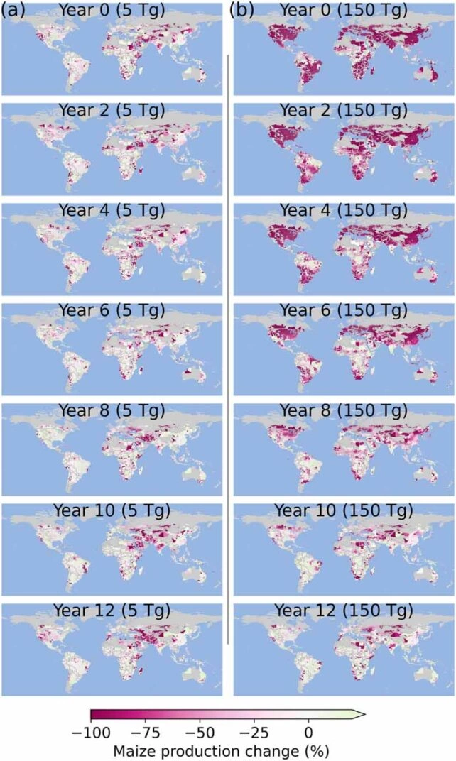 نتایج به‌دور از انتظار نبود: هرگونه جنگ هسته‌ای، حتی اگر محلی باشد، می‌تواند به کاهش قابل توجهی در تولید جهانی ذرت منجر شود. به‌طور مشخص، جنگی محلی که با تقریباً ۵.۵ میلیون تن دود وارد جو می‌کند، می‌تواند تولید جهانی ذرت را حدود ۷ درصد کاهش دهد. اما در صورت وقوع درگیری گسترده‌ای که ۱۶۵ میلیون تن دود آزاد کند، کاهش تولید تا ۸۰ درصد هم می‌تواند برسد.