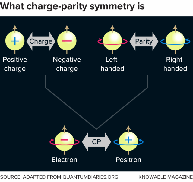 تقارن CP ترکیبی از دو عملیات است: تبدیل ذره به پادماده (تقارن بار) و تصویرآینهای آن (تقارن پاریتی). اگر هنگام اعمال CP ذرهٔ حاصل دقیقاً همان رفتار را داشته باشد، تقارن حفظ شده است. کشف مواردی از نقض تقارن CP در آزمایشها — برای نمونه در برخی مزونها از دههٔ 1960 — نشان داد که طبیعت اندکی بین ماده و پادماده تفاوت قائل است؛ اما اندازهٔ این نقض در مزونها بسیار کوچک است و به هیچوجه برای توضیح عدم تقارن کیهانی کافی نیست.