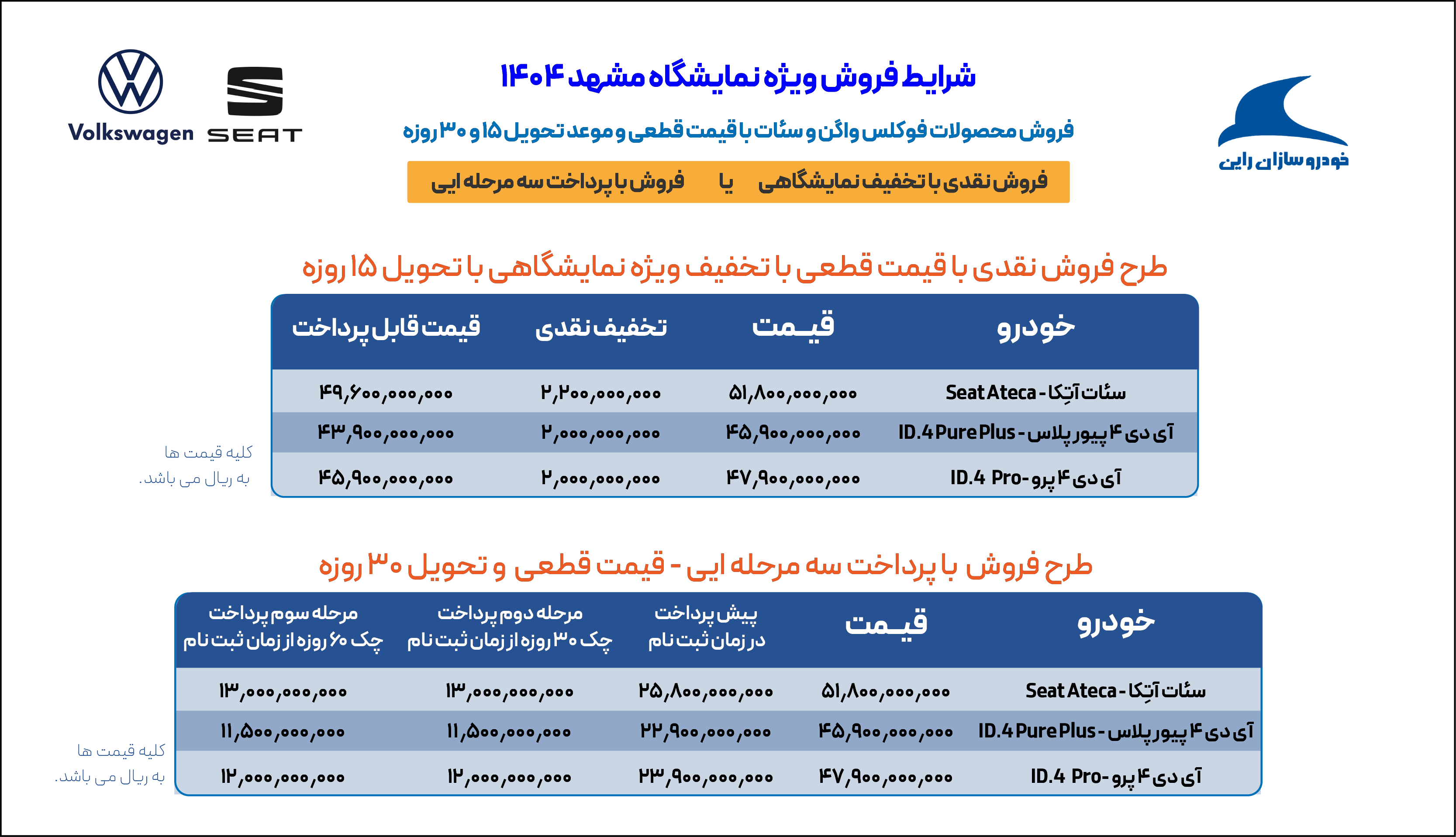 مدلهای عرضه شده: فولکسواگن ID.4 Pure Plus و ID.4 Pro مدل 2024 فول آپشن با پیمایش 601 کیلومتر با باتری 85 کیلوواتی در دو نسخه پیور پلاس و خودرو سئات آتکا 2000 سیسی توربو هستند که در دو شکل کلی به مناسبت نمایشگاه خودرو مشهد به مدت محدود و تا زمان تکمیل موجودی با تخفیف نمایشگاهی قابل عرضه است. این محصولات در دو مدل جذاب برای فروش عرضه شده اند. اول فروش نقدی یا قیمت قطعی و با تخفیف حدود 4 تا 5 درصدی ( روی محصولات مختلف متفاوت است) که البته خودرو بصورت 15 روزه تحویل مشتریان گرامی خواهد شد. جزئیات فروش نقدی و میزان تخفیف دقیق نقدی هر یک از محصولات به شرح زیر است.