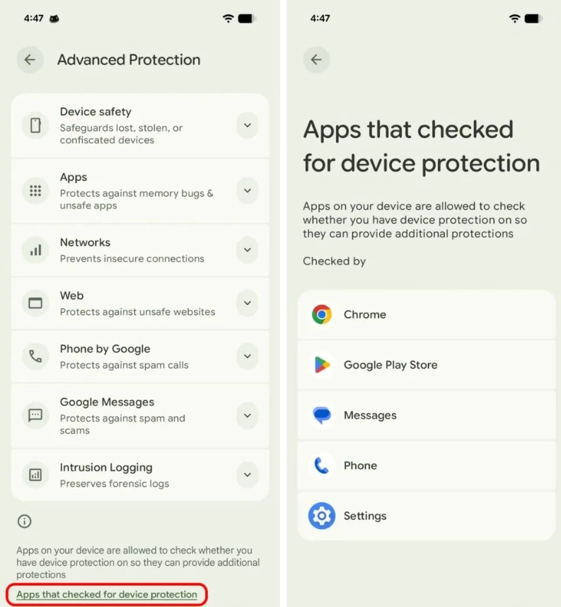 براساس یافتههای بررسی فایلهای APK و نسخه بتای Google Play Services (نسخه 25.33.32 beta)، گوگل در حال آزمایش گزینهای جدید در مسیر Settings > Security and privacy > Advanced protection است که فهرستی از برنامههایی را نشان میدهد که میتوانند بررسی کنند آیا محافظت پیشرفته فعال است یا خیر. این گزینه در پایین صفحه قرار میگیرد و به بخش جدیدی میرسد که نام تمام برنامههایی را فهرست میکند که از این API استفاده میکنند تا در صورت فعال شدن محافظت پیشرفته، شیوههای دفاعی خود را فعال کنند.