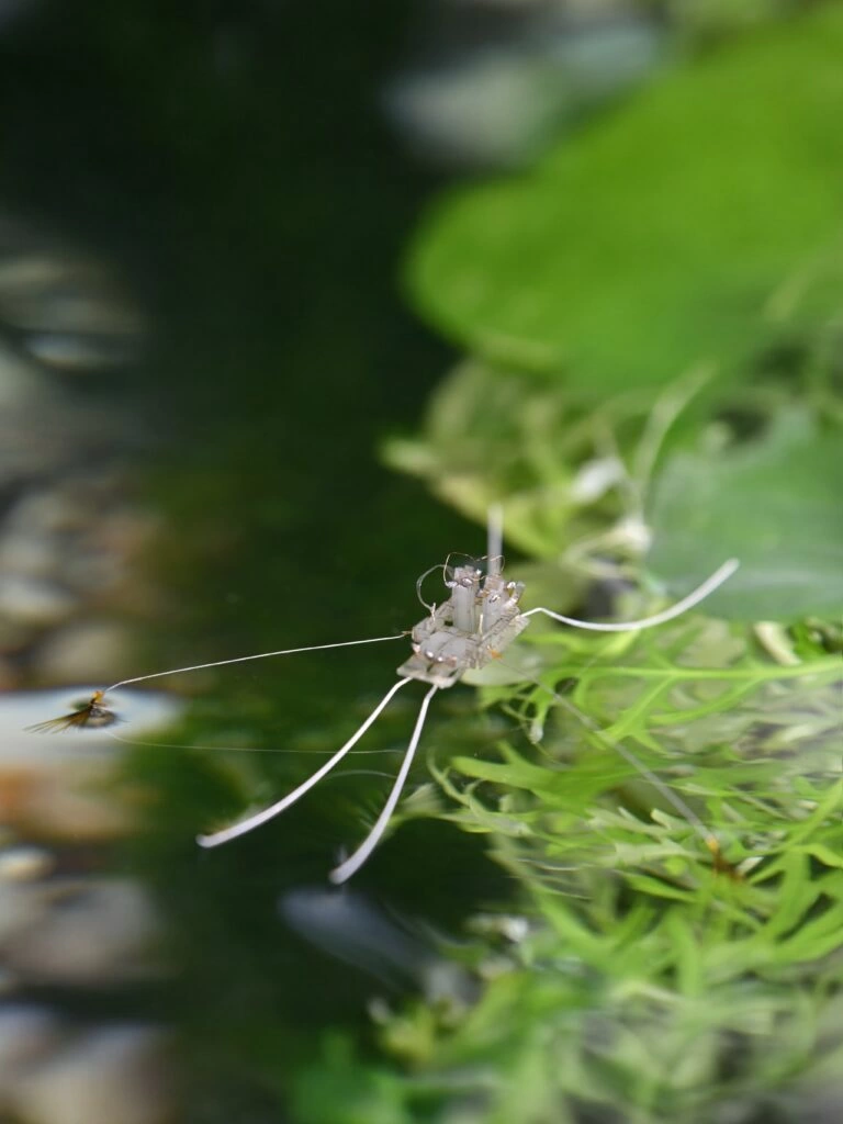 در سالهای اخیر، رباتها وظایف متنوعی از تحویل غذا تا جراحی و کاوش در سیارات دیگر را عهدهدار شدهاند. یکی از چالشهای جذاب در زمینه رباتیک نیمهآبزی، طراحی سامانههایی است که بتوانند بر روی سطح آب حرکت کنند؛ کاری که برخی حشرات کوچکِ نیمهآبزی بهطرزی استادانه انجام میدهند. Rhagovelia، گونهای از آبپیمایان (water striders) معروف به ripple bugs، دارای زوائد «پَرمانند» در انتهای پاهای میانی خود است که بهصورت غیرفعال بسته و باز میشوند و با تعامل با جریان و تنش سطحی آب سازگاری مییابند. این ویژگی الهامبخش تیم تحقیقاتی دانشگاه کالیفرنیا، برکلی شد تا نمونهٔ مصنوعی آن را بسازند: رهاگوبات.