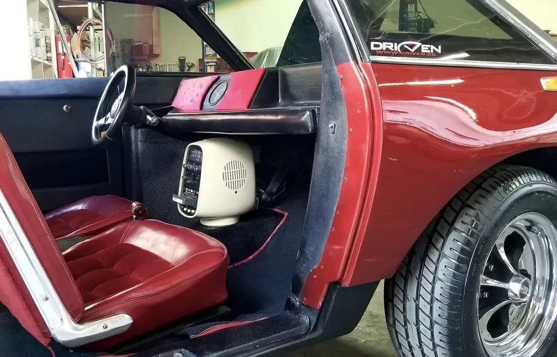 کابین فضای خود را با روکش‌های قرمز دکمه‌دار (tufted) و نیمکت گردان عقب پر می‌کند؛ حس لابی و فضای مهمانی دههٔ ۷۰ کاملاً مشهود است. در داشبورد یک پخش‌کنندهٔ 8-Track Brother Aquatron VX-33 مشاهده می‌شود که اگر صاحب بعدی کاست مناسب داشته باشد، می‌تواند تجربهٔ صوتی نوستالژیک را تکمیل کند.