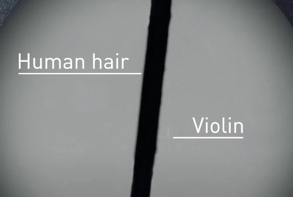 این ساختار روی یک تراشه با دو لایه رزست ایجاد شد؛ ابتدا با استفاده از دستگاه NanoFrazor الگو با نوکی گرم و حساس بر سطح حک شد، سپس لایه زیری حل شد تا حفرهای به شکل ویولن باقی بماند، بعد لایهای نازک از پلاتین نشاندند و در پایان مواد اضافی با استون پاک شد. کل فرآیند حدوداً سه ساعت طول میکشد اما رسیدن به نسخه نهایی ماهها اصلاح و بهینهسازی نیاز داشت. تصویر این ساز کوچک در کنار یک موی انسان توسط میکروسکوپ دیجیتال Keyence VHX-7000N ثبت شد.