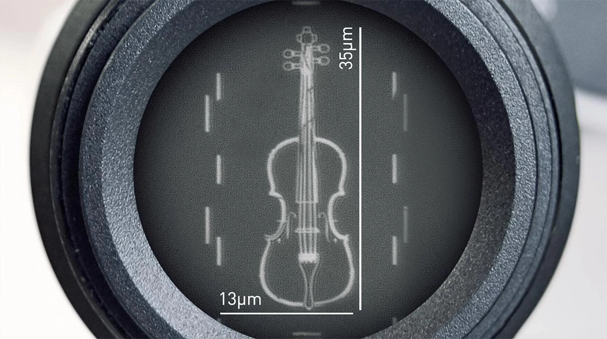 این «کوچکترین ویولن جهان» طولی برابر ۳۵ میکرون و پهنایی معادل ۱۳ میکرون دارد و در واقع برای نواختن ساخته نشده است؛ بلکه نمونهای تصویری است که دقت سیستم نانولیتوگرافی جدید دانشگاه را محک میزند. یک میکرون برابر یک میلیونم متر است؛ برای مقایسه قطر تار موی انسان بین ۱۷ تا ۱۸۰ میکرون است و موجوداتی مانند تاردیگرادها بین ۵۰ تا ۱۲۰۰ میکرون اندازه دارند.