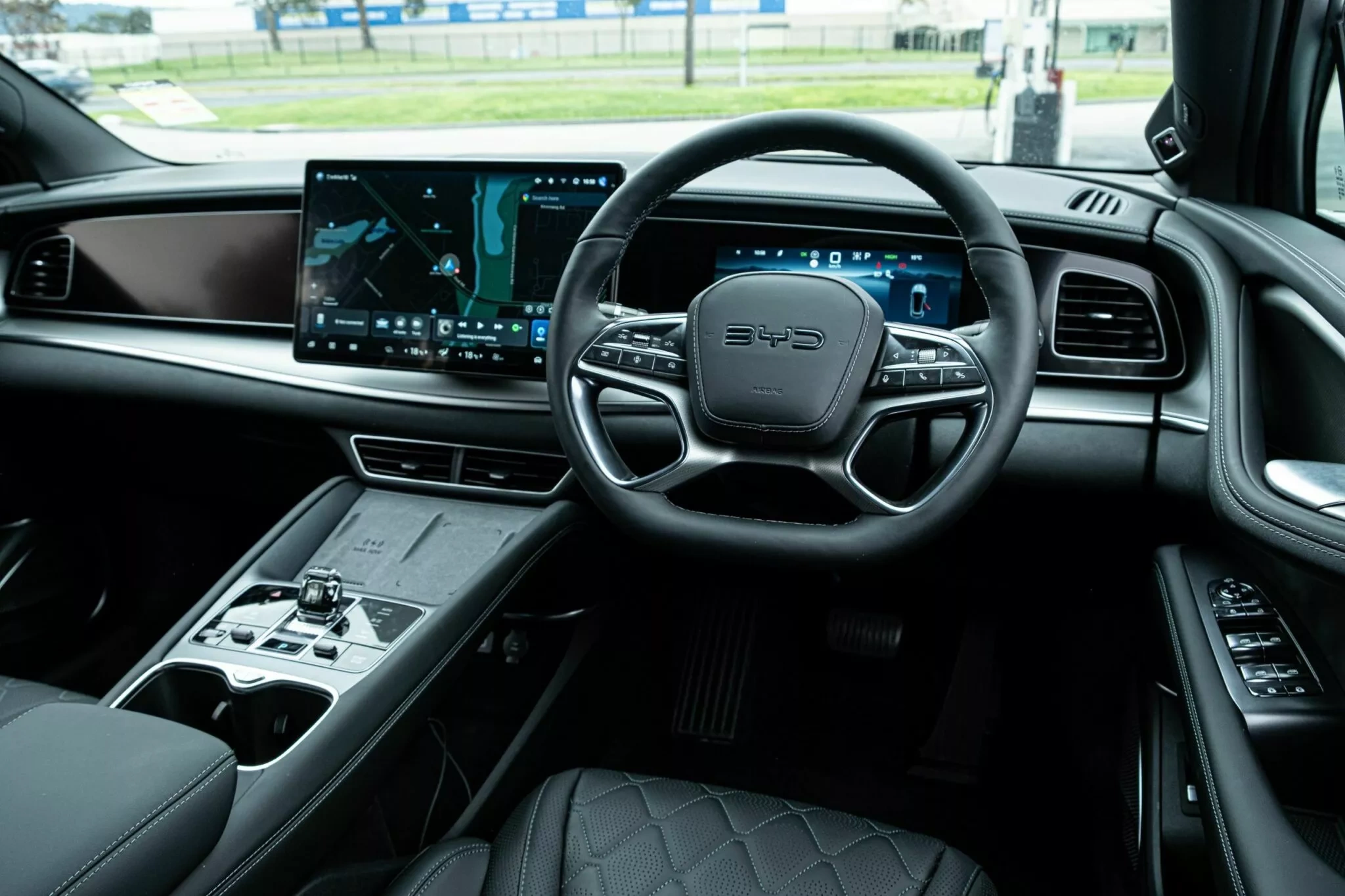 با وجود قیمت رقابتی، کابین Sealion 7 حس ارزانقیمت بودن ندارد. مواد استفادهشده شامل سطوح نرم لمسی، چرم و سوئد مصنوعی است که ترکیب ظاهری ممتاز و نزدیک به خودروهای لوکس اروپایی ایجاد کرده است. یک صفحه نمایش 15.6 اینچی بزرگ مرکز داشبورد را اشغال کرده و قابلیت تغییر بین حالت پرتره و افق را دارد؛ هرچند طراحی یکپارچهای با داشبورد ندارد و جای نصب آن تا حدی بیرونزده به نظر میرسد.