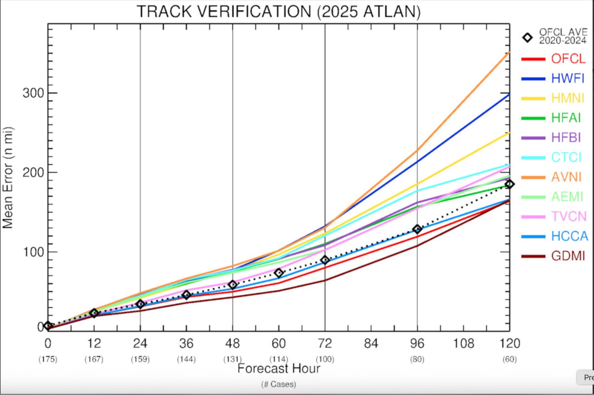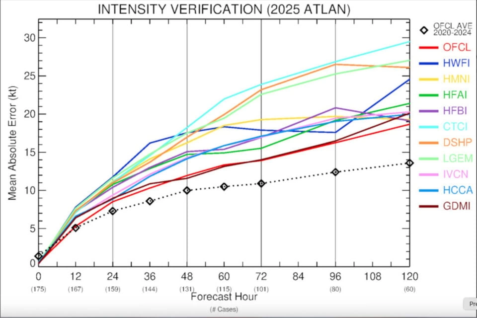 تحلیل اولیه‌ای که برایین مک‌نولدی، هواشناس و پژوهشگر ارشد دانشگاه میامی، منتشر کرد نشان می‌دهد که Weather Lab دیپ‌مایند — که از ژوئن شروع به ارائه پیش‌بینی‌ها کرد — بهترین مدل فصل برای تعیین مسیر و شدت طوفان‌ها بود. در مقابل، مدل پرکاربرد و قدیمی ایالات متحده، Global Forecast System (GFS)، ضعیف‌ترین عملکرد را داشت.