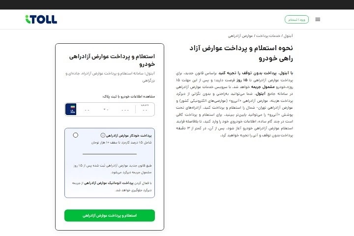 اگر قصد دارید بدون استفاده از ویژگی کیف پول داخلی آیتول، عوارض آزادراهی‌تان را مشاهده و پرداخت کنید، کافی است این مراحل را انجام دهید: ابتدا وارد وب‌سایت یا حساب کاربری خود در اپلیکیشن آیتول شوید و از بخش «خدمات پرداخت» روی «عوارض آزادراهی» کلیک کنید. سپس پلاک خودرو را در کادر صفحه بعد وارد نمایید و روی «استعلام و پرداخت عوارض آزادراهی» کلیک کنید. در نهایت نیز پس از مشاهده بدهی یا بدهی‌ها، آن‌ها را به‌صورت موردی یا تجمیعی پرداخت کنید.