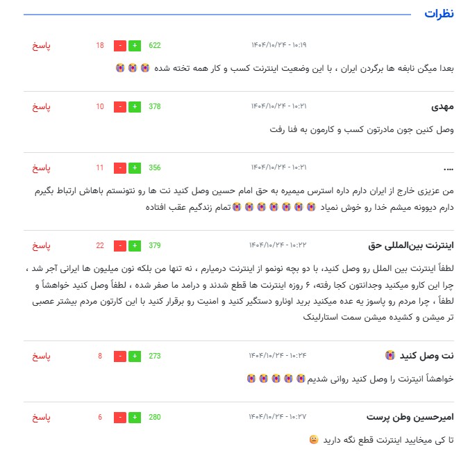 • لطفاً اینترنت بین الملل رو وصل کنید، با دو بچه نونمو از اینترنت درمیارم ، نه تنها من بلکه نون میلیون ها ایرانی آجر شد ، چرا این کارو میکنید وجدانتون کجا رفته، ۶ روزه اینترنت ها قطع شدند و درامد ما صفر شده ، لطفاً وصل کنید خواهشاً و لطفاً ، چرا مردم رو پاسوز یه عده میکنید برید اونارو دستگیر کنید و امنیت رو برقرار کنید با این کارتون مردم بیشتر عصبی تر میشن و کشیده میشن سمت استارلینک