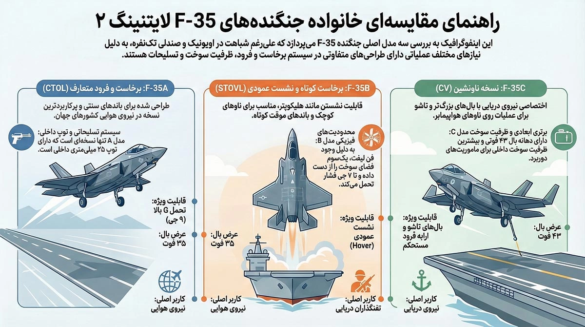 اما آیا واقعا میتوان یک بدنه را برای سه مأموریت کاملاً متفاوت بهینه کرد؟ پاسخ مهندسان لاکهید مارتین، خلق سه برادر ناتنی بود: F-35B ،F-35A و F-35C. سه جنگنده که شاید در ظاهر شبیه به هم باشند، اما در زیر پوسته رادارگریزشان، دنیاهای متفاوتی دارند.