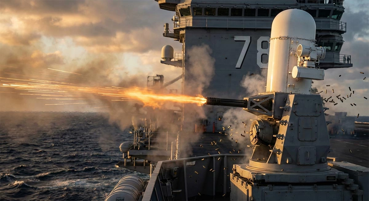 سیستم دفاع نزدیک فالانکس (Phalanx CIWS): آخرین خط دفاعی! این سیستم که شبیه به مینیونهای رباتیک است، به یک توپ گاتلینگ ۲۰ میلیمتری مجهز شده که میتواند ۴۵۰۰ گلوله از جنس اورانیوم ضعیفشده را در یک دقیقه شلیک کند. فالانکس دیواری از سرب و آتش ایجاد میکند که هر موشک نزدیکشوندهای را در فاصله ۲ مایلی پودر میکند.