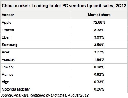 این میزان فروش در بزرگترین بازار تکنولوژی جهان، یک عدد کاملا منحصر بفرد و بیرقیب به حساب میآید. به طوری که رقیب بعدی آیپد، لنوو با 8.38% در جایگاه دوم و حتی وضع سامسونگ بدتر از آن یعنی نصف رقم لنوو با 3.59% در جایگاه چهارم قرار دارد.
