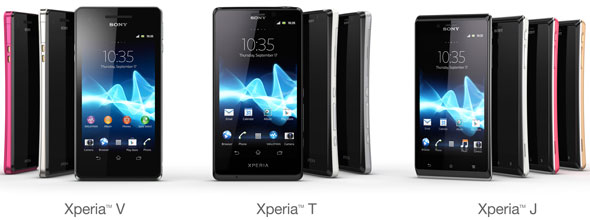 Xperia V در بسیاری از ویژگیها با Xperia T مشترک است ولی مبتنی بر LTE برای عملکرد فوق سریع شبکه بوده و با بالاترین سطح مقاومت در برابر آب برای تلفن هوشمند به بازار عرضه خواهد شد. Xperia J از یک طراحی خیرهکننده بهره برده و با اندازه متمایز صفحه نمایش گزینهای مناسب برای مصرفکنندگانی است که میخواهند مقرون به صرفه بودن را در شمایلی زیبا تلفیق نمایند.