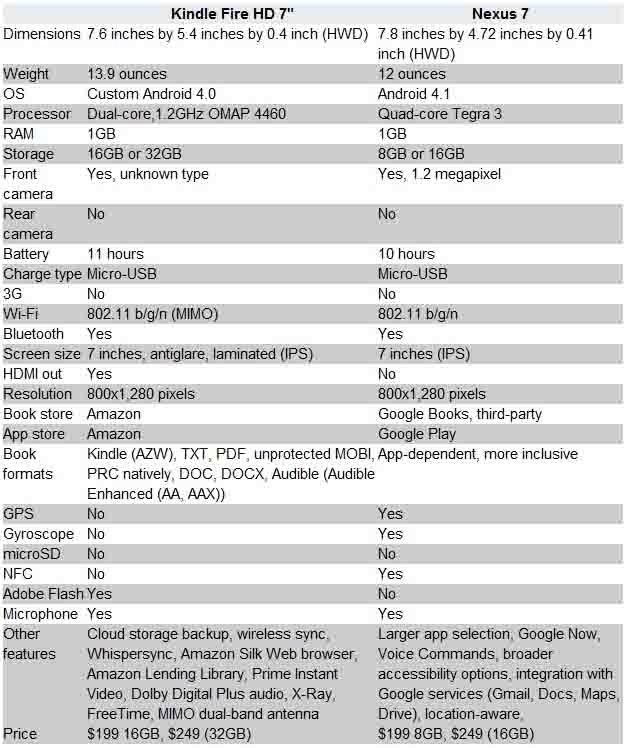 در این قسمت برنده Kindle Fire HD7 است (البته به لطف قیمت گذاری خوب و مناسب Kindle Fire HD7). نکسوس 7 نسخه 16 گیگابایتی 249 دلار قیمت گذاری شده است در حالی که Kindle Fire HD7 نسخه 16 گیگابایتی تنها 199 دلار قیمت دارد و Kindle Fire HD7 نسخه 32 گیگابایتی 249 دلار بها دارد. متاسفانه نکسوس 7 نسخه 32 گیگابایتی ندارد. از آنجاییکه هیچ کدام از 2 تبلت شیار کارت حافظه ندارند و فقط باید به حافظه داخلی آنها اکتفا کرد، وجود نسخه 32 گیگابایتی برگ برندهای برای محصول جدید آمازون محسوب میشود.