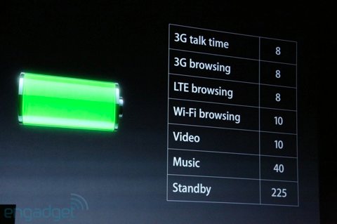 در مورد باتری آیفون 5 نیز وی ادعای 225 ساعت حالت آماده بهکار، حدود 10 ساعت پخش ویدئو، 8 ساعت زمان مکالمه در 3G و LTE و همچنین 10 ساعت کارکرد روی WiFi را دارد. به عبارتی با افزایش عملکرد دستگاه، بازده باتری نیز تا حدودی افزایش یافته است.