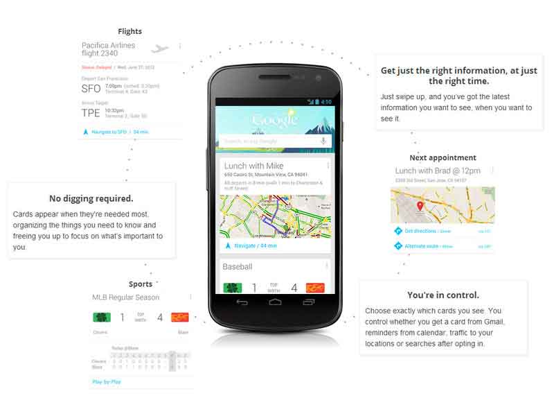 دنیایی را تصور کنید که هر اطلاعاتی و در هر زمینهای میخواهید تنها با اشاره انگشتتان فراهم شود (یا حتی در مواردی با فرمان صوتی شما!). Google Now دنیایی از امکانات مختلف را در هر لحظه و بنا بر شرایط خاصی که در آن قرار دارید در اختیار شما قرار میدهد. مثلا فرض کنید در حین حرکت به سمت مکانی که در آن قراری دارید هستید. این برنامه به صورت هوشمند در صورت ترافیک در مسیری که در آن حرکت میکنید یا فاصله زیاد شما با مقصد و امکان دیر رسیدن شما، خودش مسیرهای جایگزین پیشنهاد میکند!